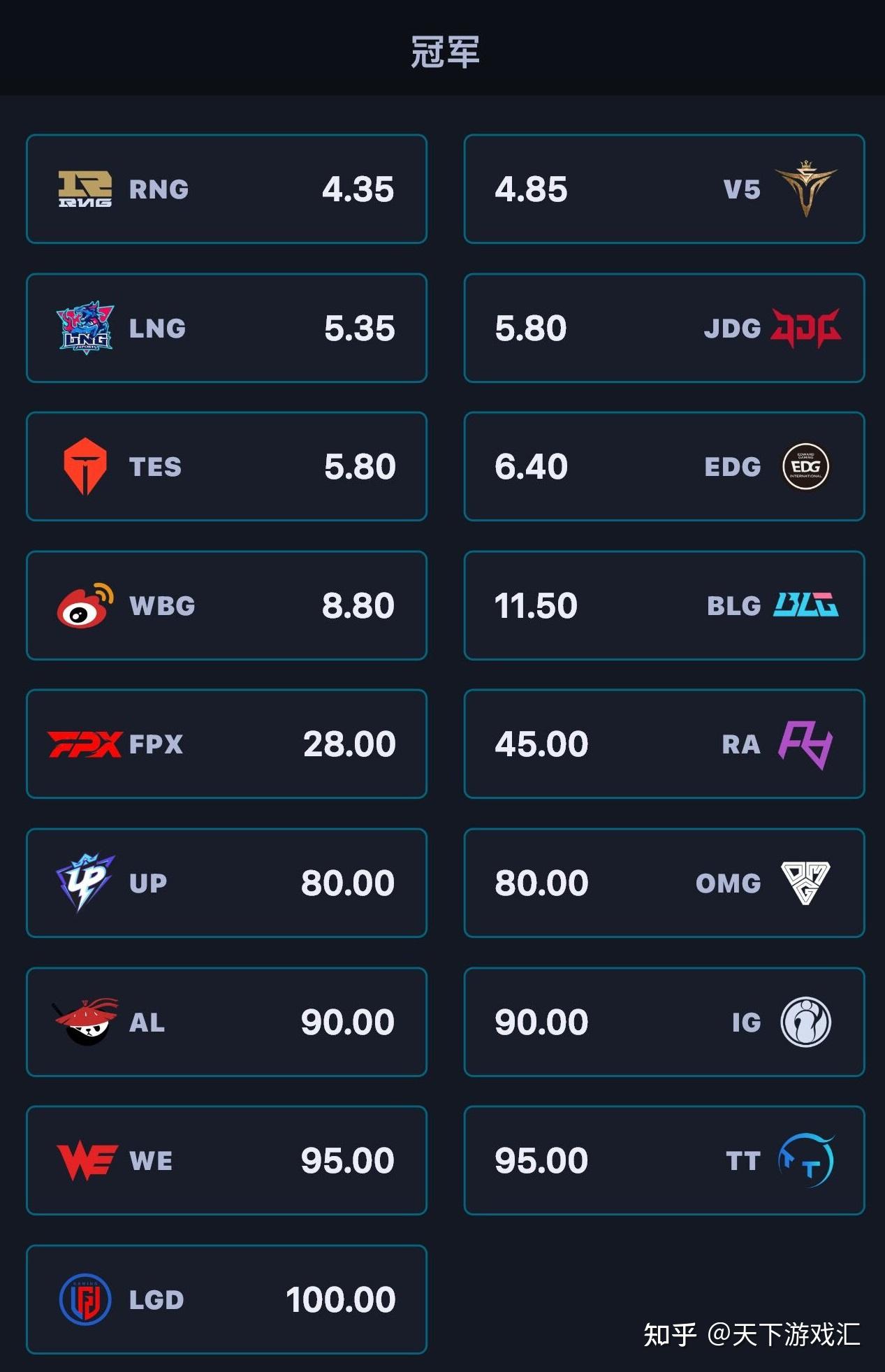 结果这次夏季赛的赔率属实让人有些惊讶,接下来我们就来看看各支战队的一个赔率排名,看看是否符合大家心中对于战队实力的一个预测。